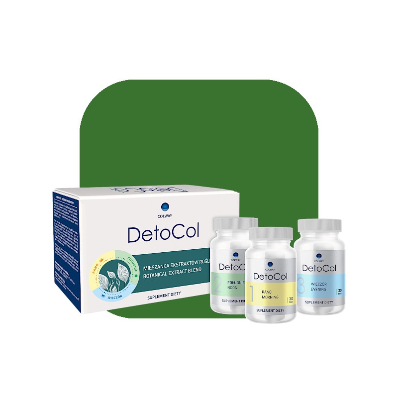 DetoCol składa się z trzech rodzajów kapsułek – RANO, POŁUDNIE i WIECZÓR – z których każda zawiera inne ekstrakty roślinne, dobrane z myślą o komplementarnym działaniu w ciągu dnia.